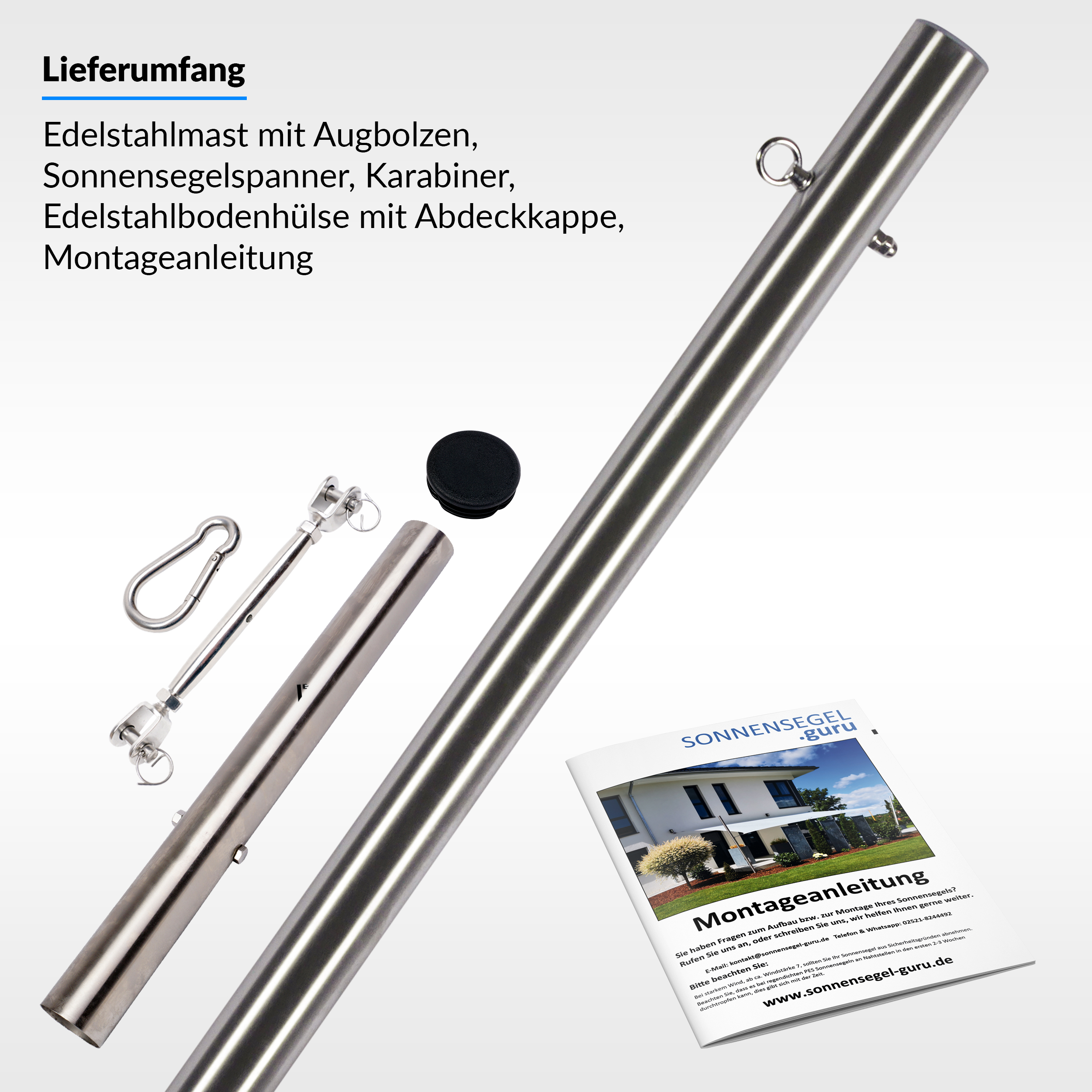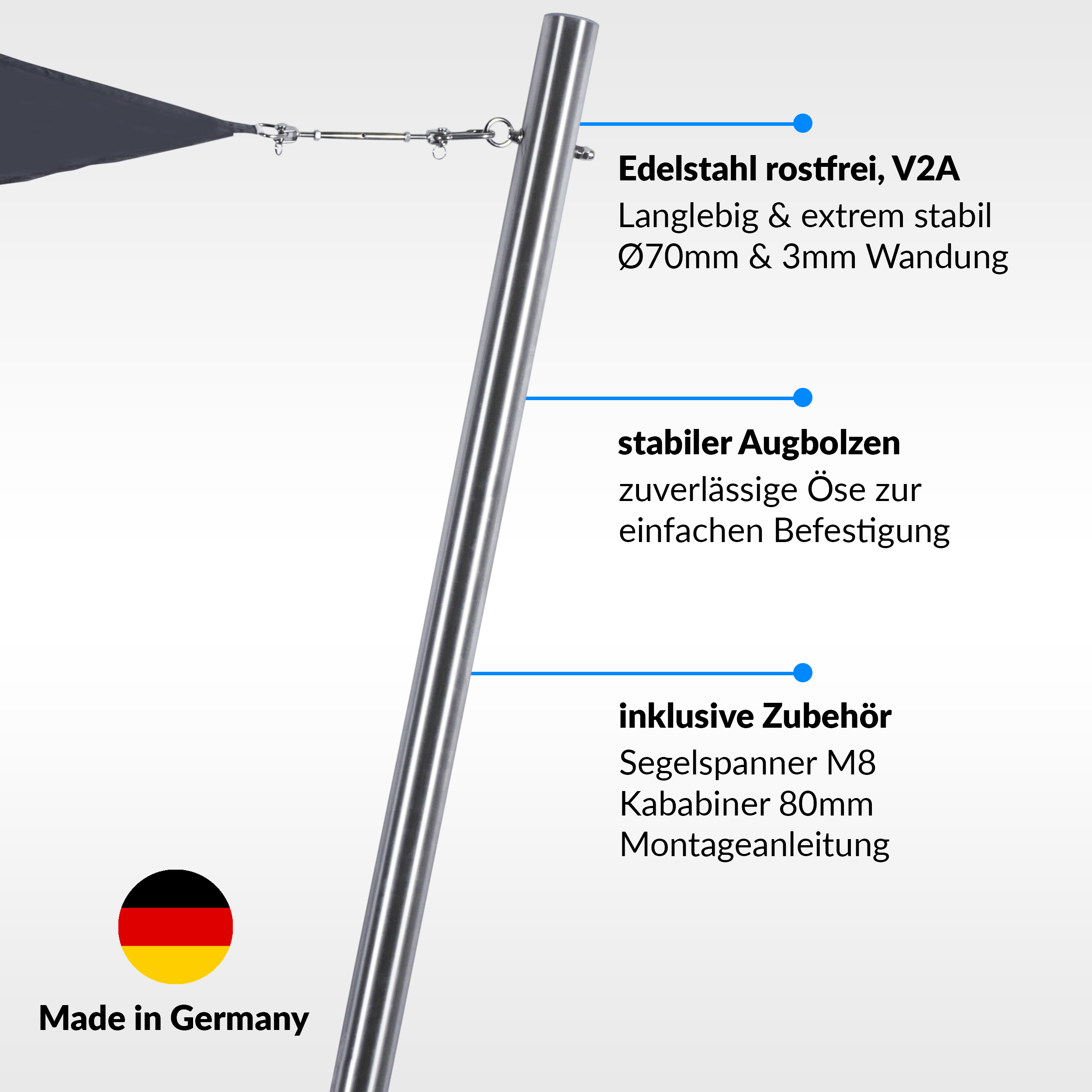 Dieser Sonnensegel-Mast bietet auch großen Sonnensegeln bis 30 Quadratmeter eine zuverlässige und stabile Befestigungsmöglichkeit. Er ist aus 3 mm starkem Edelstahl gefertigt, das dank seiner extremen Robustheit für Jahre nicht nur starken Halt bietet, sondern dabei auch noch schick aussieht. Mit seinem fest angebrachten Augbolzen ist dieser Sonnensegel-Mast die ideale Ergänzung zu bereits bestehenden Sonnensegel-Anlagen. Sonnensegel-Mast mit Augbolzen: Alle Vorteile im Überblick: Bestellen Sie jetzt unseren Sonnensegelmast mit Augbolzen im Durchmesser 70 x 3 mm und ergänzen Sie ihre Sonnensegel-Anlage – für sonnige Stunden auf Ihrer Terrasse oder in ihrem Garten. Mindestens ein Mast einer Sonnensegel-Anlage sollte höhenverstellbar sein, alle anderen Ecken können an einem Sonnensegel-Mast mit fester Öse befestigt werden. Zunächst legen Sie fest, welche Ecke Ihres Sonnensegels an diesem Mast mit Augbolzen befestigt werden soll, dann starten Sie mit dem Einbau. Sonnensegel-Masten werden in der Regel über eine Bodenhülse verankert, die in ein frostsicheres Betonfundament eingebaut wird. Der Beton ist getrocknet und der Mast sitzt fest verankert an Ort und Stelle? Dann können Sie Ihr Sonnensegel einhängen und die Bereicherung Ihrer Sonnensegel-Anlage genießen! Nach oben ist der Sonnensegel-Mast mit einer Abdeckkappe aus grauem Kunststoff verschlossen. Damit Ihr Sonnensegel-Mast perfekt zu Ihrer Sonnensegel-Anlage passt, haben Sie die Wahl. Sie können ihn entweder mit oder ohne Bodenhülse bestellen, wahlweise aber auch als Sonderanfertigung mit einem Mastfuß, der für die Befestigung auf einem Betonfundament geeignet ist. Tipp: Sprechen Sie uns für Sonderanfertigungen oder ein Sonnensegel nach Maß an. Gerne besprechen wir mit Ihnen alle Einzelheiten und setzen Ihre Wünsche in die Tat um. Nehmen Sie dazu einfach Kontakt mit uns auf, alle Möglichkeiten diesbezüglich finden Sie im Kontaktformular. Gerade bei einer Sonnensegel-Befestigung mit feststehendem Augbolzen ist die Mastlänge wichtig für die Funktionalität Ihrer Sonnensegel-Anlage. Deswegen gibt es diesen Mast in drei Längen von 2,5 m bis zu 3,5 m, damit er sich optimal an Ihre ausgewählten Befestigungspunkte anpasst. Wird er niedrig gewählt, kann der Mast zugleich den tiefsten Punkt der Sonnensegel-Anlage bilden und für zuverlässigen Abfluss von Regenwasser sorgen, wenn ein regendichtes Segel verwendet wird. Damit es gleich nach der Montage losgehen kann, bringt unser Sonnensegel-Mast mit Augbolzen hochwertiges Befestigungsmaterial für Ihr Sonnensegel gleich mit. Mit einem 80 mm Karabiner und einem Segelspanner für das Feinjustieren der Spannung sorgen Sie für ein optimal gespanntes Sonnensegel. Selbstverständlich besteht das Spannmaterial ebenso wie der Sonnensegel-Mast aus hochwertigem rostfreiem Edelstahl. Sie können sicher sein, dass sich alle Teile durch höchste Robustheit auszeichnen und über viele Jahre hinweg Wind und Wetter zuverlässig trotzen. Wartung ist dank der hervorragenden Materialeigenschaften nicht nötig, da das Edelstahl rostfrei und säure- sowie salzwasserbeständig ist. Dieser Mast mit feststehender Befestigung ist die ideale Ergänzung für Ihre Sonnensegel-Anlage, wenn Sie bereits über eine oder mehrere Möglichkeiten zur Höhenverstellung verfügen. Gerne beraten wir Sie rund um die Einsatzmöglichkeiten! Unsere hochwertigen Segelmasten und Wandhalter stellen wir selbst unter unserer eingetragenen Marke Toldoro her. Die Befestigungsmaterialien sind auf den langjährigen Einsatz im Freien ausgelegt, damit Sie ihr Segel sorgenfrei nutzen können und lange Freude an Ihrer Sonnensegel-Anlage haben. Überzeugt von der Qualität unserer Produkte gewähren wir Ihnen auf Masten und Wandhalter 5 Jahre Garantie. SALE Mast mit Kratzern auf der Rückseite (siehe Foto) - optischer Mangel der sich nicht auf die Stabilität auswirkt.