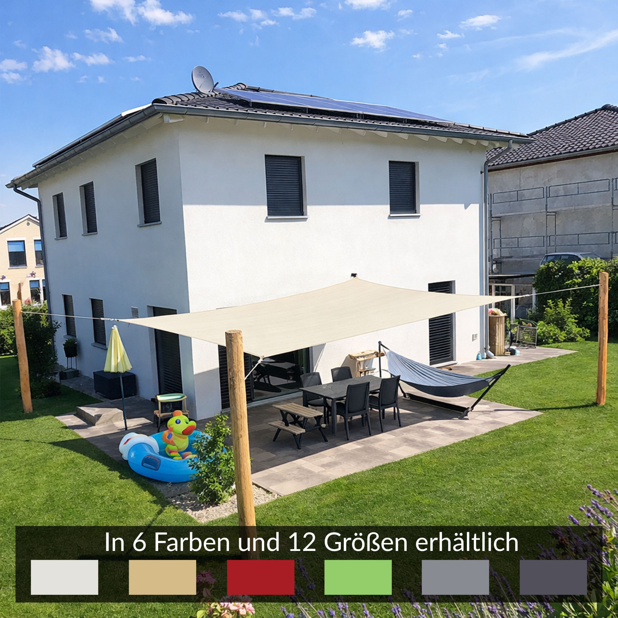 Dieses Sonnensegel-Komplettset bietet nicht nur wunderbaren Schatten, sondern auch zuverlässigen Sonnenschutz und sogar Schutz vor Regenschauern. Ein Wandhalter und drei frei positionierbare Sonnensegel-Holzpfosten erlauben es Ihnen, einen individuellen Lieblingsplatz mit idealer Aufenthaltsqualität zu gestalten. Das Komplettset enthält ein Sonnensegel in rechteckiger Form aus regendichtem PES, wählbar in zwölf verschiedenen Größen. Alles, was Sie zur Montage und Befestigung benötigen, kommt in diesem Komplettpaket direkt zu Ihnen nach Hause. Alle Komplettset-Vorteile auf einen Blick Machen Sie mehr aus Ihrem Garten und spendieren Sie ihm einen neuen Schattenplatz! Gerne beraten wir Sie auch persönlich per Telefon, E-Mail und sogar per WhatsApp-Messenger! An heißen Tagen macht es ein schattiger Rückzugsort oft überhaupt erst möglich, weiter draußen zu verweilen. Sonnenliebhaber wissen, dass UV- und Hitzeschutz wichtig sind, um den Sommer in vollen Zügen genießen zu können. Unser Sonnensegel-Komplettset eröffnet mit einem Wandhalter und drei Sonnensegel-Holzpfosten neue Gestaltungsoptionen. Sie erschließen sich neue Plätze rund um Ihr Haus oder Nebengebäude, die optimal beschattet werden und von Neuem das Potenzial zum Lieblingsplatz erhalten. Unter dem mitgelieferten PES-Sonnensegel sind Sie sicher vor UV-Strahlung, Sonnenhitze und sogar Regenschauern. Das ultraleichte und dennoch regendichte Material bietet eine luftige Optik und lässt sich an den Holzpfosten perfekt spannen. Die Sonnensegel-Holzpfosten sind in zwei Größenvarianten erhältlich, damit Sie Ihre Sonnensegel-Anlage perfekt an die Gegebenheiten vor Ort anpassen können. Diese Teile sind in unserem Sonnensegel-Komplettset mit einer Wandbefestigung und drei Holzpfosten enthalten: Sie haben noch nie eine Sonnensegel-Anlage mit Wandhalter und Holzpfosten aufgebaut? Mit der beiliegenden aussagekräftigen Schritt-für-Schritt-Anleitung ist das kein Problem und problemlos zu schaffen. Jeder Garten, jede Terrasse ist ein bisschen anders. Deswegen bietet unser Sonnensegel-Komplettset so viele Individualisierungsmöglichkeiten. Zwölf Segelgrößen und eine konzeptionsbedingte Vielfalt an Standorten macht es einfach, einen passenden Platz im eigenen Garten für diese Sonnensegel-Anlage zu finden. Mit sechs tollen Farben erhalten Sie zudem weiteren Gestaltungsspielraum. Mit diesem Komplettset erweitern Sie einfach bereits bestehende Lieblingsplätze um zusätzliche Schattenfläche oder schaffen einfach einen ganz neuen Platz mit optimaler Aufenthaltsqualität. Einen wunderbar natürlichen Look bieten unsere Sonnensegel-Holzpfosten. Sie bestehen aus europäischem Robinienholz, das sich durch extreme Robustheit, Witterungsbeständigkeit und Widerstandskraft gegen Schädlinge auszeichnet. In Sachen Stabilität und Haltbarkeit steht es seinem Pendant aus Edelstahl in nichts nach. Damit Ihre Sonnensegel-Anlage perfekt zu Ihrem Garten passt, gibt es die drei Holzpfosten in zwei Varianten zur Auswahl. Einmal mit 3m Höhe für ebenerdige Terrassen und mit 3,5m Höhe, wenn der Sonnensegel-Pfosten unterhalb des Terrassenniveaus eingebaut werden soll. Eingehängt wird das Sonnensegel in die im Holzpfosten eingebaute Öse. Da dieses Sonnensegel-Komplettset nur eine Wandbefestigung besitzt, haben Sie hier reichlich Wahlfreiheit, was den Standort betrifft. Der Wandhalter kann in die unterschiedlichsten Materialien von Klinker bis Ytong eingebaut werden. Für den optimalen Sitz erhalten Sie alle notwendigen Montagematerialien für den Wandhalter gleich mitgeliefert. Mit Schrauben und Montagemörtel befestigt hält der Wandhalter auch hohem Winddruck bis Windstärke 7 stand. Das Sonnensegel wird nach erfolgtem Einbau in die auf der Ankerplatte befestigten Öse eingehängt. Sonnensegel und Befestigungsmaterialien sind auf bei kleineren Größen bereits starken Kräften ausgesetzt. Damit der sichere Betrieb bis Windstärke 7 gewährleistet sein kann, bekommen Sie alle notwendigen Befestigungsmaterialien gleich mit im Set. Zum Einhängen des Segels am Wandhalter erhalten Sie einen Karabinerhaken und einen Segelspanner zum schnellen Nachjustieren. Für die Befestigung an den Holzpfosten ist eine zusätzliche Höhenverstellung möglich. Hier erhalten Sie drei Ösen, eine einfache und eine doppelte Umlenkrolle sowie eine Sicherheitsklemme und 7m robustes Tauwerk aus dem Segelbereich. Selbstverständlich ist dieser Pfosten auch ohne Höhenverstellung mit nur einer Befestigungsöse für das Sonnensegel erhältlich. Alle Befestigungsmaterialien sind aus hochwertigem Edelstahl, das pflegefrei und rostfrei ist, damit Sie sich auf viele Jahre Einsatzbereitschaft freuen können. Wie wünschen Sich ein passendes Sonnensegel für Ihren Lieblingsplatz? Gerne unterstützen wir Sie per Kontaktformular oder per WhatsApp an 02523 9989010 bei der Entscheidungsfindung. Auch Farbmuster Ihrer bevorzugten Farben erhalten Sie an Ihre Adresse auf Wunsch per Post. Wir freuen uns auf Ihre Anfrage! Unsere hochwertigen Segelmasten und Wandhalter stellen wir selbst unter unserer eingetragenen Marke Toldoro her. Die Befestigungsmaterialien sind auf den langjährigen Einsatz im Freien ausgelegt, damit Sie ihr Segel sorgenfrei nutzen können und lange Freude an Ihrer Sonnensegel-Anlage haben. Überzeugt von der Qualität unserer Produkte gewähren wir Ihnen auf Masten und Wandhalter 5 Jahre Garantie.