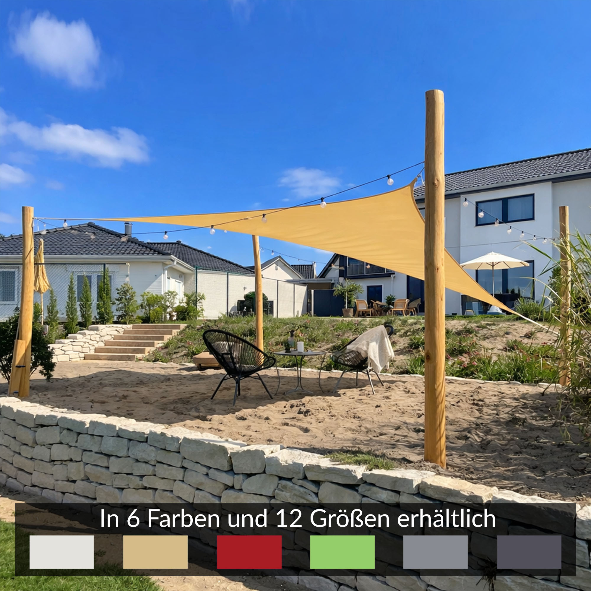 Dieses freistehende Sonnensegel in viereckiger Form begeistert als ideale Beschattungslösung, wenn Sie sich ein Maximum an Flexibilität wünschen und den natürlichen Look von Robinienholz lieben. Egal, ob Sie Ihrer Terrasse im Sommer an besonders heißen Tagen ein angenehmes Klima spenden möchten, einen schattigen Garten schaffen wollen oder nach einem zuverlässigen Schattenspender für den Sandkasten Ihrer Kinder suchen - dieses freistehende Sonnensegel-Kompletttset mit Holzpfosten in drei Varianten ist zudem sogar regendicht. Erfahren Sie hier, was unser freistehendes Sonnensegel Komplettset mit Holzpfosten so besonders macht. Alles, was Sie benötigen, um Ihr Sonnensegel-Komplettset mit vier freistehenden Holzpfosten aufzubauen ist bereits im Lieferumfang enthalten. Lediglich der Beton für den Einbau der Holzpfosten wird noch gebraucht: Da alle Teile dieses Sonnensegel-Komplettsets perfekt aufeinander abgestimmt sind, erhalten Sie ein absolut sicheres, für den jahrelangen Einsatz bestimmtes Produkt. Starten Sie jetzt in eine neue Gartensaison mit angenehm schattigem Ambiente und erleben Sie den Sommer ganz neu! Sie haben Fragen zu unseren Produkten oder wünschen sich eine Beratung? Wir stehen Ihnen gerne mit Rat und Tat zur Seite! Wie Sie uns erreichen, erfahren Sie im Kontaktformular. Als Kern dieser Beschattungslösung konfigurieren Sie sich Ihr freistehendes Sonnensegel Komplettset anhand von sechs verschiedenen Sonnensegel-Farben einfach selbst und stimmen Sie es auf Ihre Garten- oder Fassadengestaltung ab. Für das Gewebe kommt hochwertiges PES zum Einsatz, ein Material, das sowohl UV-Schutz bietet als auch Regendichtigkeit. PES ist zudem extrem reißfest und sorgt für Schutz vor Regenschauern, wie sie im Sommer üblich sind. Auch bei Regen bleibt Ihre Terrasse ein Ort der Entspannung! Die freistehende Bauweise macht dieses Sonnensegel-Komplettset zum Verwandlungskünstler, denn in Sachen Standortwahl sind Sie komplett frei. Auch Gartenteiche oder Pools können damit gezielt beschattet werden. Die vier Sonnensegel-Pfosten werden über Betonfundamente fest im Boden verankert. Ein entsprechender Fundamentplan befindet sich in der Montageanleitung und erleichtert den Einbau. Die Holzpfosten sind ebenso robust wie Edelstahlmasten und überzeugen mit der gleichen Stabilität. Gegenüber Schädlingen sind sie unempfindlich und erfordern auch keine weitere Behandlung. Damit Sie individuell auf die Gegebenheiten vor Ort reagieren können, gibt es unsere Sonnensegel-Holzpfosten individuell konfigurierbar, entweder mit einer festen Öse oder einer Dreifach-Höhenverstellung über drei Ösen. Es empfiehlt sich, mindestens einen Holzpfosten mit Höhenverstellung per Flaschenzug zu wählen, damit bei Regen das für den Wasserablauf notwendige Gefälle schnell und unkompliziert hergestellt werden kann. Aus diesem Grund ist auch einer der Holzpfosten in diesem Komplettset bereits mit einer Höhe von nur 3m vorgesehen. Das Sonnensegel wird über Karabiner und Seilspanner auf der jeweils gewünschten bzw. vorhandenen Höhe eingehängt. Zusätzlichen Komfort bietet eine Befestigung über ein Umlenkrollen-System, das ein schnelles Spannen des Segels ermöglicht. Damit Ihr freistehendes Sonnensegel für Jahre herrlichen Schatten spendet werden ausschließlich hochwertige Materialien mit hoher Robustheit eingesetzt. Sowohl Masten als auch das Befestigungsmaterial sind wartungsfrei und ermöglichen den Betrieb des Sonnensegels bis Windstärke 7. Alle Metallteile bestehen entweder aus Edelstahl oder eloxiertem Aluminium und haben sich im Segelbereich als extrem widerstandsfähig erwiesen. Auch die mitgelieferten Taue entsprechen unseren höchsten Ansprüchen an Robustheit und Widerstandskraft. Von Frühjahr bis Herbst kann diese freistehende Sonnensegel-Anlage in Betrieb bleiben – für viele Jahre. Freistehende Sonnensegel bieten den Vorteil der freien Standortwahl. Zudem kann das Sonnensegel dank der zahlreichen wählbaren Varianten Ihren Wünschen individuell angepasst werden. Genießen Sie die Sonnentage des Jahres noch unbeschwerter mit Ihren Lieben und legen Sie jetzt mit dem Selbstbau Ihres neuen Sonnensegels los! Jetzt Lieblingsfarbe und Größe auswählen und gleich bestellen! Sie haben Fragen zu unseren Produkten, wünschen eine Stoffprobe oder benötigen eine Beratung? Kein Problem, nutzen Sie unser Kontaktformular oder schreiben Sie uns per WhatsApp an 02523 9989010 mit ihrer Adresse und ihre bevorzugten Farben und wir senden ihnen diese per Post zu. Unsere hochwertigen Segelmasten und Wandhalter stellen wir selbst unter unserer eingetragenen Marke Toldoro her. Die Befestigungsmaterialien sind auf den langjährigen Einsatz im Freien ausgelegt, damit Sie ihr Segel sorgenfrei nutzen können und lange Freude an Ihrer Sonnensegel-Anlage haben. Überzeugt von der Qualität unserer Produkte gewähren wir Ihnen auf Masten und Wandhalter 5 Jahre Garantie.