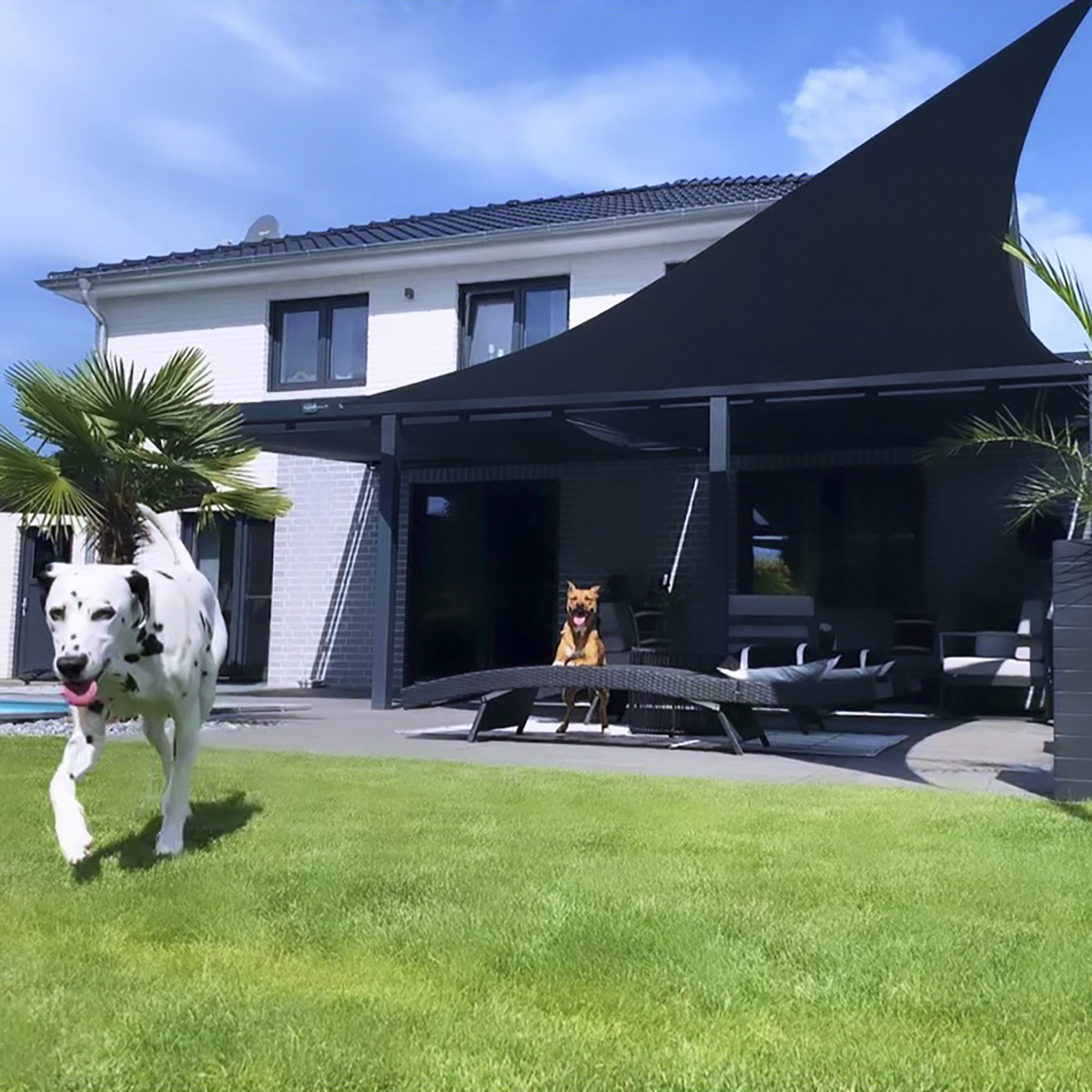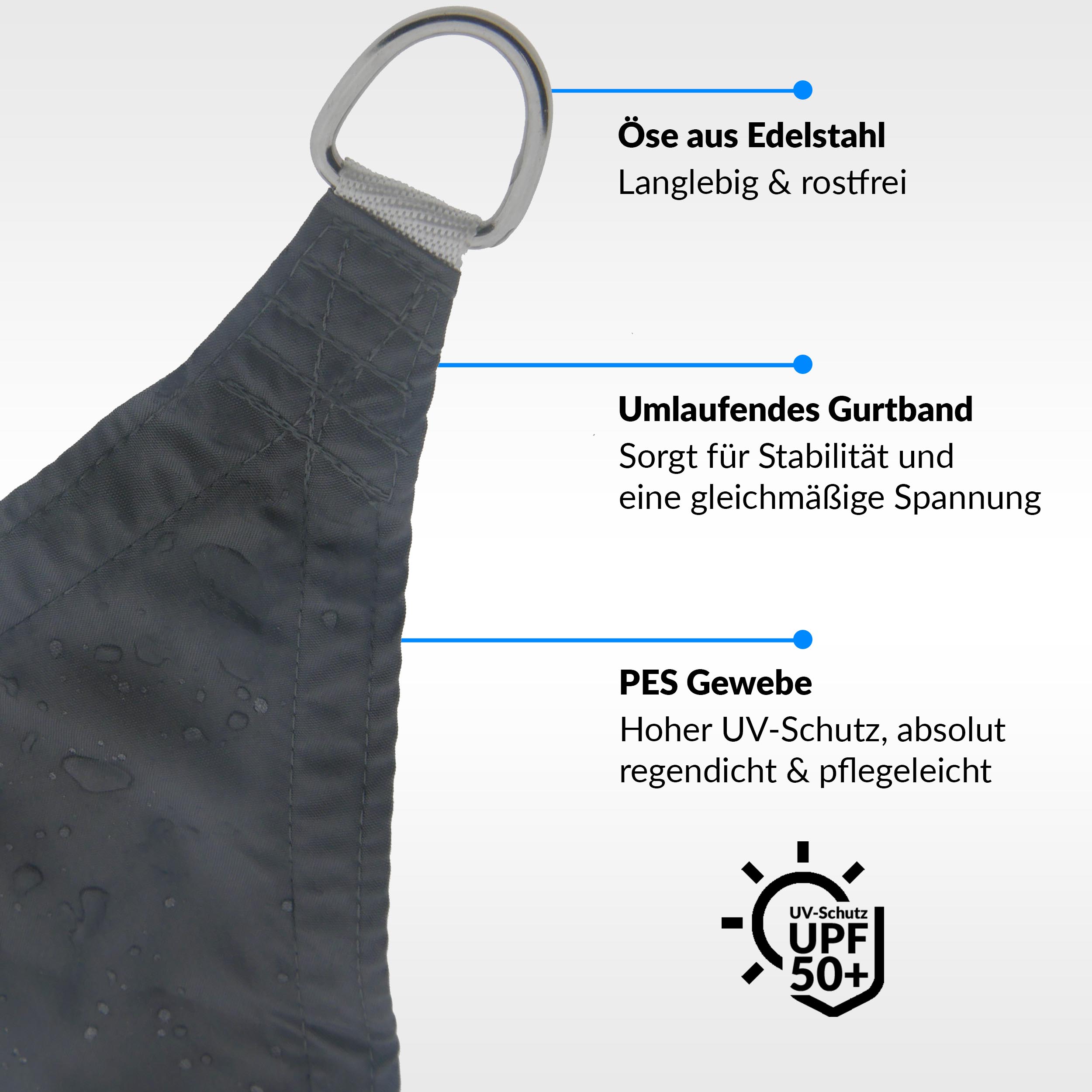 Genießen Sie optimalen Schutz vor Sonne, UV-Strahlen, Regen und Hitze mit diesem regendichten Sonnensegel im Dreieck. Mithilfe des robusten Gurtbandes befestigen Sie das Segel unkompliziert an Hauswänden, Masten oder Stangen. So liefert Ihnen dieses Segel mit UPF50+ angenehmen Sonnenschutz. Die hervorragende Verarbeitung des hochwertigen Stoffs mit ca. 160g/m² und rundumlaufenden Gurtbändern sorgt für eine lange Haltbarkeit. Durch den leichten Stoff, lässt sich das Sonnensegel darüber hinaus optimal spannen. Ab einer Neigung von 25% kann Regen ungehindert ablaufen und das Segel ist regendicht. Bei starker Sonneneinstrahlung zeigt konkave Sonnenschutzsegel in Dreiecksform seinen Vorteil gegenüber Sonnenschirmen. Durch den Einsatz von höhenverstellbaren Masten gewinnen Sie zusätzliche Flexibilität, Sie können Ihren Sonnenschutz mit einfachen Handgriffen dem Sonnenverlauf anpassen und so während der Sonnenstunden angenehmen Schatten genießen. Die Luft kann weiterhin zirkulieren, während die Temperaturen im Schatten angenehm bleiben. So können Sie heiße Sommertage genießen, denn auch ihre Möbel, der Gartenteich oder die Terrassensteine bleiben angenehm kühl. Wenn sich die Sonne einmal hinter Wolken versteckt und ein Schauer Sie überrascht, können Sie entspannt bleiben. Denn unter unserem regendichten, dreieckigen Sonnensegel bleiben Sie im Trockenen. Bei einer Neigung von mindestens 25% ist das Sonnensegel regendicht und der Regen kann ganz einfach abfließen. Der Grillabend auf der Terrasse ist also bei jedem Wetter gerettet! Sie sind sich unsicher, für welche Farbe Sie sich entscheiden sollen? Fordern Sie kostenlos bis zu 4 Stoffmuster an. Schicken Sie uns hierfür eine Nachricht mit Ihrer Adresse und den gewünschten Farben per WhatsApp an 02523 9989010, per E-Mail an kontakt@sonnensegel-guru.de oder einfach in unserem Chat.